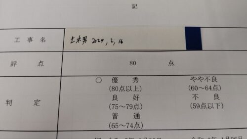 Bクラスの工事の場合、よほどのことがない限り79点がMAX点なのですが、今回の工事では80点で優秀の評価を受けることができました。